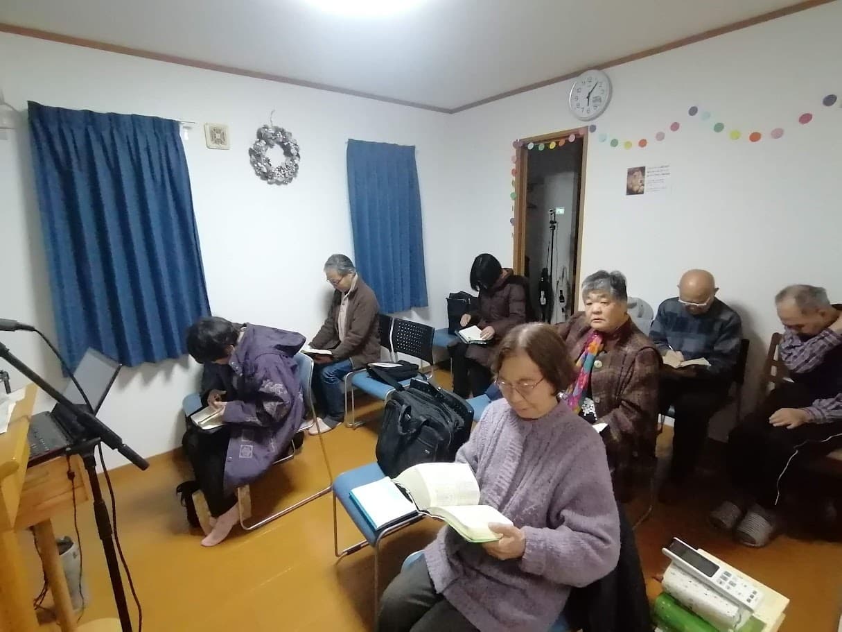 讃美歌、聖書朗読、地域のための祈り(すべての人の為、政治家、牧師、病気の方、被災地、拉致被害者、戦争の収束のため)